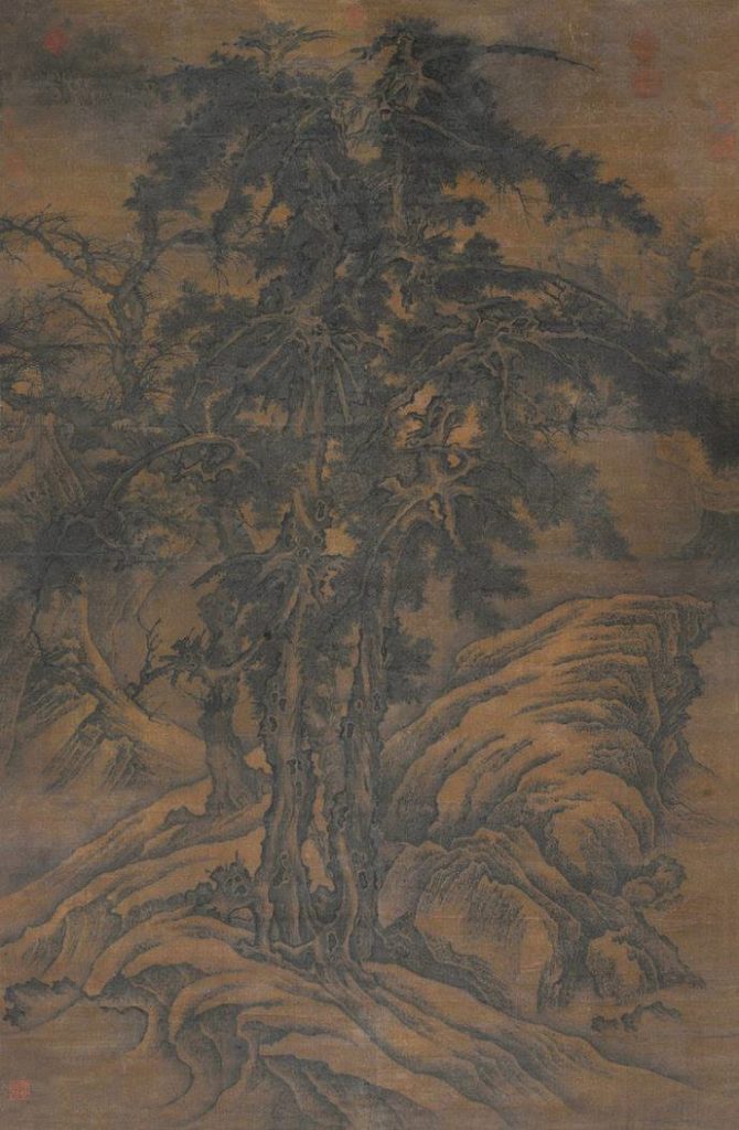 いつもありがとうございます。李成(919-967)は唐朝の帝室の末裔であり、祖父の代に南の蘇州から北の青州に移り、晩年に陳州の刺史に招かれて住みました。儒家に生まれ、寒さに切り立つ樹で逆境に打ち勝つ心を表し、淡墨で鈎勒(輪郭)を描き、皴法(ひだ)で埋める描き方を避け、蟹爪(筆線の点折)で枝振りを描き、樹法(樹の描き方)を見いだしました。